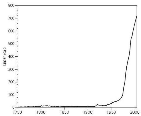 Ich bin sicher, dass ich mit dieser Argumentation nun gegen irgendein Axiom oder eine Annahme Deiner reinen Modelllehre verstoßen habe. Sei´s drum. So sagt es eben die Realität oder besser die inflationäre Empirie. Es ist kein Zufall, dass die untenstehende Index-Grafik (1750 bis 2003) sowohl die Geldmengenentwicklung als auch die Inflationsentwicklung aufzeigt.