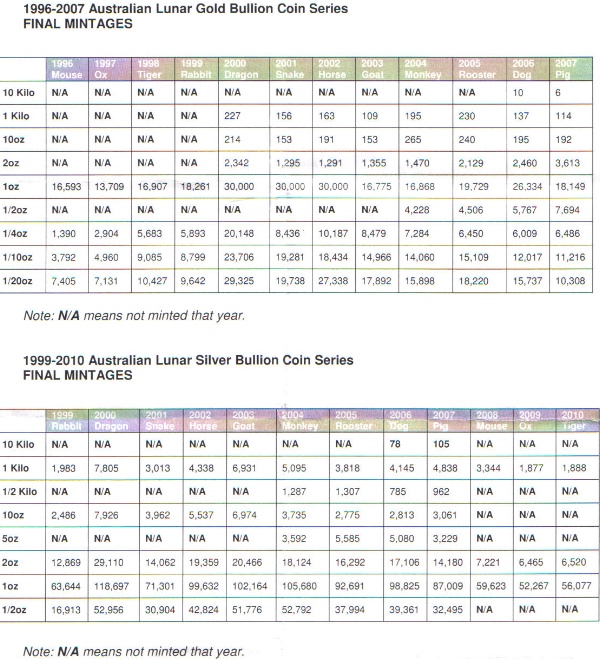 Weiß jemand mittlerweile wie die wirkliche Auflagenhöhe der einzelnen 1-oz-Lunarmünzen bis 2007 lauten? Sie wollten doch ursprünglich Ende letzten Jahres die Zahlen nennen. Dabei wurde das schon x-mal verschoben. Kann jemand genaueres nennen?