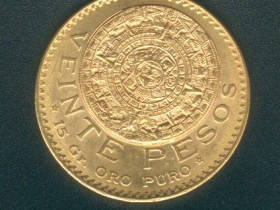 Eine mexikanische 20 Peso Münze, mit dem Aztekenkalender als Motiv.