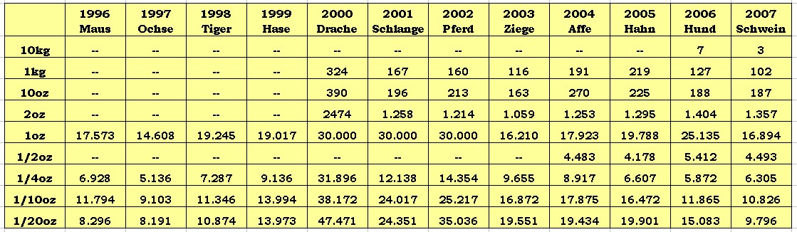 Das ist ja das "Problem" mit den Münzen, für welche immer schon heftige Aufpreise bezahlt wurden: die steigen nicht so rasand mit dem POG mit, wie die normalen Buillons...Im Gegenteil: alles gleicht sich z.Z. an....