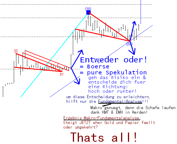 besten Dank fuer deine Meinung ueber die Grenzen & Moeglichkeiten der Elliott-Zaehlerei und dem MUSS ueber die 200er-Korrektur. Habe mir mal ein Buch ueber die Elliott-Technik geholt. Genau wie die Volkswirtschaftslehre, die Kapitalmarktheorie,etc ist EW fuer mich nur eine aehnlich uebertrieben ausformulierte Banalitaet, aus der man komplex-klingende Ableitungen schafft, um wissenschaftlich zu klingen & zu gelten sowie die Endlichkeit des Gehirns der Leserschaft zu begrapschen. Im Grunde genommen wird aber lediglich eine Banalitaet "extensiert", um potentielle Juenger zu gewinnen, die an die dunklen Grenzen ihres Hirns angekommen sind und eine fuehrende Hand benoetigen, und somit die Schlussfolgerung eher den Wissenschaftlern ueberlassen.
