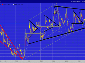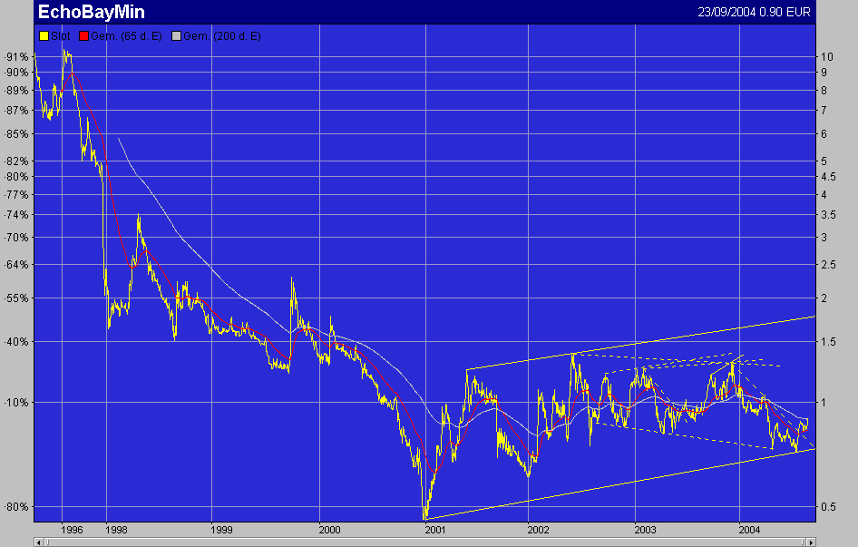 ende 2003 gings mit der impulsbewegung zum breakout, welcher zusammen mit dem pullback zum oberen schenkel allerdings nicht halten konnte - der kurs brach unterhalb des unteren schenkels ein, thrust nach unten, doch dieser scheint ebenfalls nicht zu halten, denn der kurs bricht nicht wirklcih stark und nachhaltig nach unten ein, was darauf hinlaufen koennte, dass es ein fake-breakout nach unten war. die roten widerstaende sind da, doch der kurs macht den anschein, zur spizte zurueckkehren zu wollen, dort entscheidet sich, ob hoch oder runter. die rote linie ueber der spitze bei 1muss genommen werden, DANN gehts zur naechsten roten widerstandslinie, welche einen interessanten freiraum offenhaelt a la Thrust: von etwa 1 bis 1,30 (schneller 30% Anstieg). Danach ein weiterer Widerstand, und wenn dieser genommen werden kann (im Thrust sollte dies kein problem sein) dann gehts weiter von etwa 1,30 auf 1,80 (ca. 40%). wenn dieser dann genommen wird, dann gehts los.