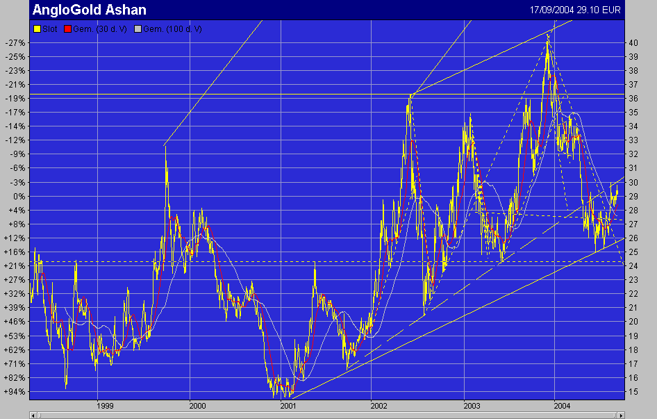 Doch dann kam der Goldpreiseinbruch, und der Thrust hielt nicht, brach ab, und das uebergeordnete rote 3eck kam wieder ins Spiel, und rettete den Kurs. Der Kurs brach zwar unterhalb des roten 3ecks ab, doch summa sumarum ein ganz gutes Ergebnis, denn der starke heftieg Kursverfall schleuderte genau die Investoren raus, doie so zittrige Haende haben - und es waren viele, vielleicht ein paar zuviele, denn die rote unterstuzteung hat nicht ganz gehalten, dennoch: sie haelt! Dert Kurs tangelt sich seitdem an dieser roten wieder hinauf, ein gutes Zeichen, und billiges Einstiuegsniveau generell sowas. Vorsicht allemal, denn wenn AngloGold jetzt bald wieder an der Spitze angelangt ist, und Gold wieder einsackt, dann duerften doch so manche, die vorher nicht verkauft haben, jetzt die schnautze voll haben.