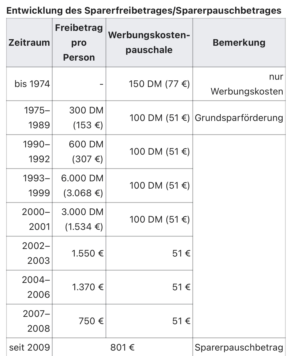 Hier kann man schön den ganzen Irrsinn sehen. Nicht nur, dass der Freibetrag seit einer Dekade weginflationiert wird, wir hatten bis Anfang des Jahrhunderts bereits einen Freibetrag von 6.000 DM. Wo ist er hin?