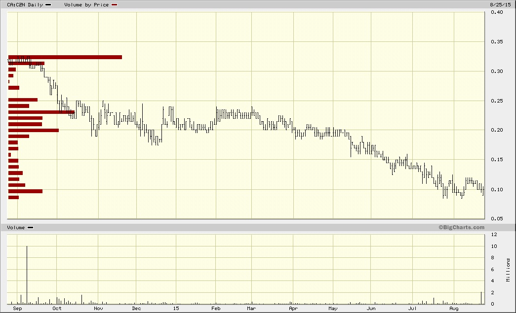 • In den letzten Tagen hat die Canadian Zinc die 0,10 Ca $ Grenze unterschritten ... . Außerdem hat da gestern jemand sehr gezielt bei zwischen 0,095 und 0,10 Ca $ 2 Millionen Shares gesammelt. Das ist erwähnenswert, da man um so einen Volume Peak zu finden 12 Monate zurückblicken muss!
