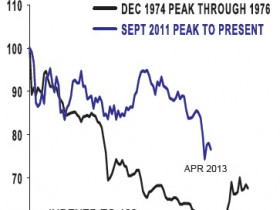 Chart 1 shows you today’s gold fall from its September 2011 record peak compared to the 1974-76 time period. We indexed the peaks to 100 so you can see true time and percentage decline comparisons....“