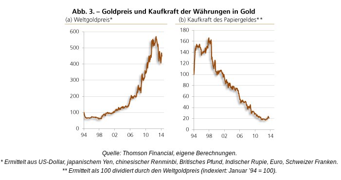 "...Seit etwa Mitte 1998 bis heute hat die Kaufkraft aller (an dieser Stelle betrachteten) Währungen gegenüber dem Gold um etwa 88 Prozent abgenommen (siehe Abb. 3, Grafik (b))..."