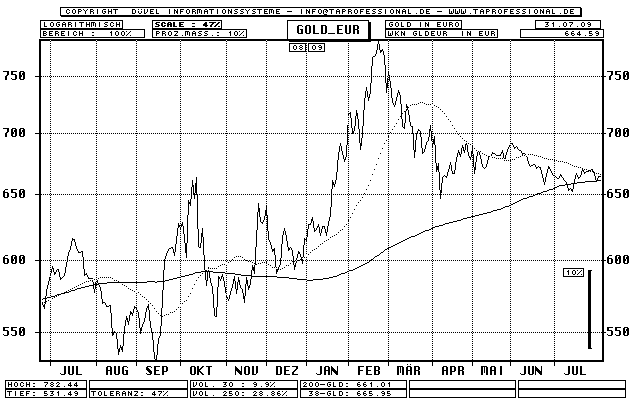 Wenn Charts etwas nützen, dann die Gegenwart und Vergangenheit zu zeigen; und da schwankte bereits Eurogold heftig, sh. rechten Chart!.
