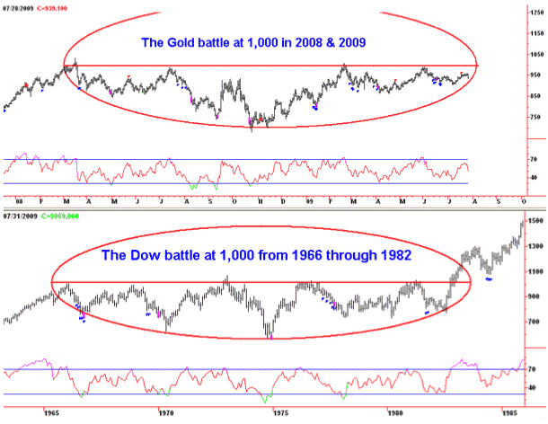 Another fractal pattern of interest is the comparison of the multiple attempts of gold to breakout through $1,000 and the sixteen year consolidation that the Dow Industrials made before clearing 1,000. Don't under-estimate the potential on the upside....."