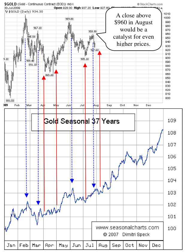 "The sixteen month consolidation of the US$ gold price continues. Based upon the history of August being a pivotal month coupled with the consolidation having a similar price pattern with 1994, 2002 and 2007 we believe that a close above $960 would be expected to trigger a move to the all-time highs.