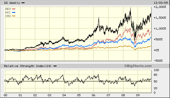 Daß mit einigen Aktien weitaus höhere Gewinne möglich gewesen wären, zeigt ein Vergleich zweier Gold Bluechips -- Goldcorp und Agnico Eagle -- vs. HUI und XAU.