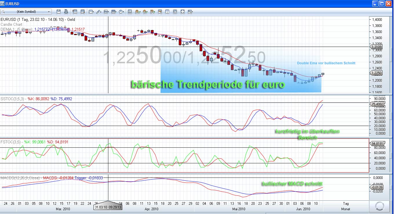 Derzeit ist die double ema trendlininie dabei, erstmals seit Mitte april wieder einen Euro-aufwärtstrend einzuläuten.
