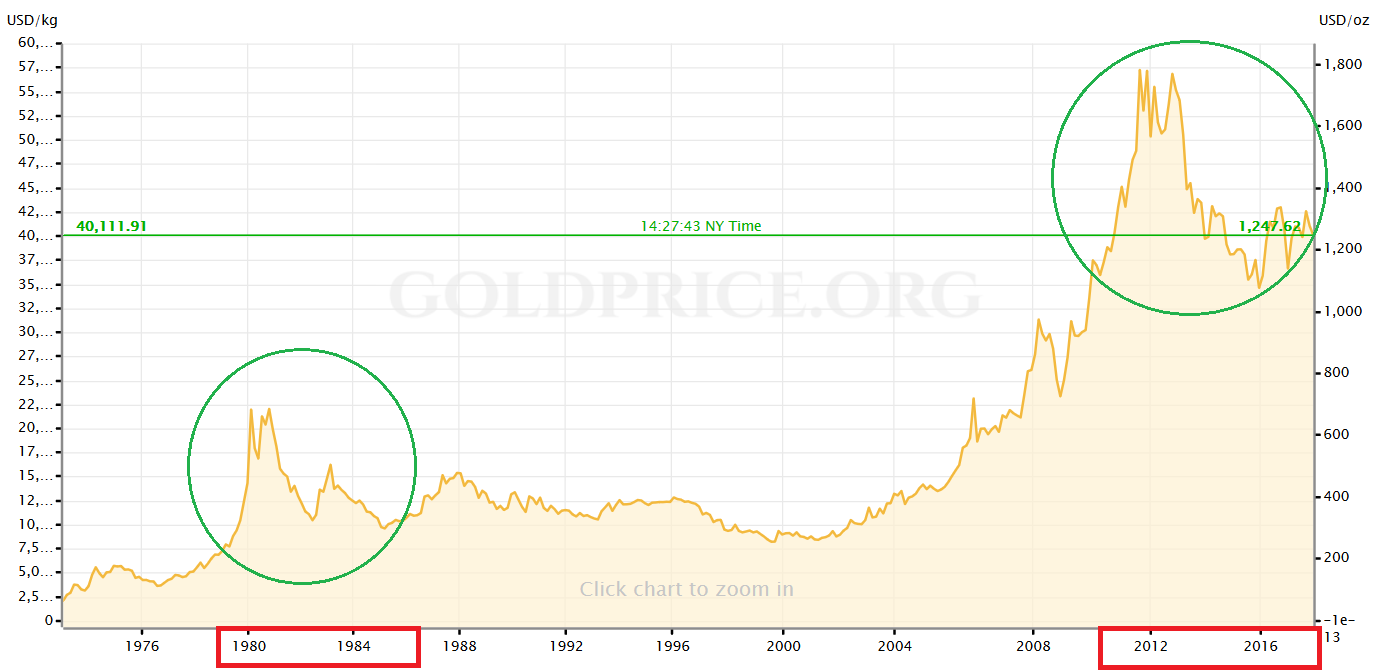 1980-1984 gabs schon mal so einen ähnlichen Kurvenverlauf wie 2012-2016. Vielleicht geht Gold jetzt erstmal viele Jahre lang seitwärts??? Könnte es mir leider eher vorstellen, als dass es nach oben geht....