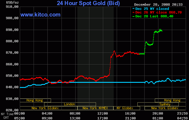 Am 26. 12. haben die US-Börsen zwar geöffnet, doch für gewöhnlich sind die Umsätze winzig. Das dürfte auch für die Edelmetallmärkte zutreffen, sodass schon kleinere Transaktionen grössere Kursbewegungen auslösen können. Der HUI läuft ja auch davon - da müsste man mal einen Blick auf das tatsächliche gehandelte Volumen werfen.