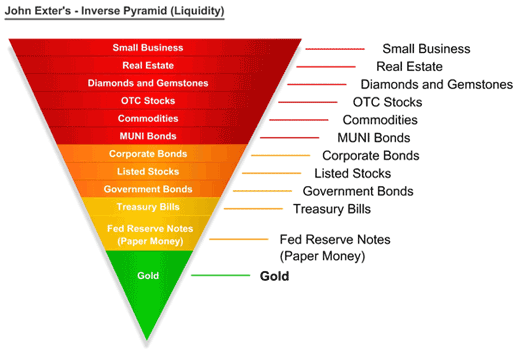 "John Exter's liquidity pyramid that is. Exter was a central banker who worked at the federal reserve in the 1940s and 1950s and somehow emerged with his intellect intact. He was on the inside, knew how the system worked and yet didn't like Keynesian or Friedmanite economics. His concern about a global fiat money system, once it emerged, was that it would eventually blow out in a deflationary implosion rather than an inflationary one. This is the opposite of what most Gold bugs believe and yet results in a similar conclusion: Gold Gone Wild (i.e. strong bull market in Gold).....
