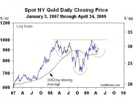 Ich stelle den POG-Chart mit Monatsabschlußdaten rein. Da sich deutlich eine inverse SKS-Formation abzeichnet, welche gerade ihr Pullback an einer der Nackenlinien erreicht, meine ich als Chartlaie ein Kaufsignal herauszulesen. In der Literatur ist diese Formationen bullisch bewertet, wenn ein gefallener Preis sein Tief erreicht und diese Formation zeichnet. Im aktuellen POG-Chart steht diese inverse SKS jedoch am Ende eines Anstieges von den Jahren 2000 bis 2008.(.....)