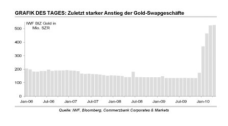 "...Vor allem die Zentralbanken der südeuropäischen Staaten kommen als mutmaßliche Swap-Partner der BIZ in Frage. Früher durften sie als Unterzeichner des Zentralbank-Goldabkommens CBGA keine Gold-Derivate abschließen. Im neuen CBGA-Abkommen vom September 2009 wurde aber diese Klausel gestrichen. Im Juni haben laut dem World Gold Council die Zentrabanken Griechenlands, Spaniens und Portugals 112,2; 281,6 bzw. 382,5 Tonnen Gold gehalten...."