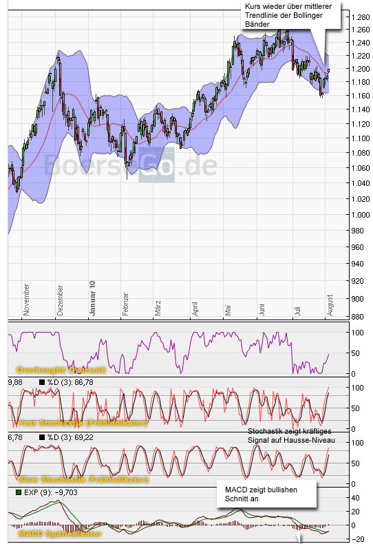 heute vormittag ist Gold das erste mal seit beginn der korrektur oberhalb der Trendlinie in den Bollinger Bändern,