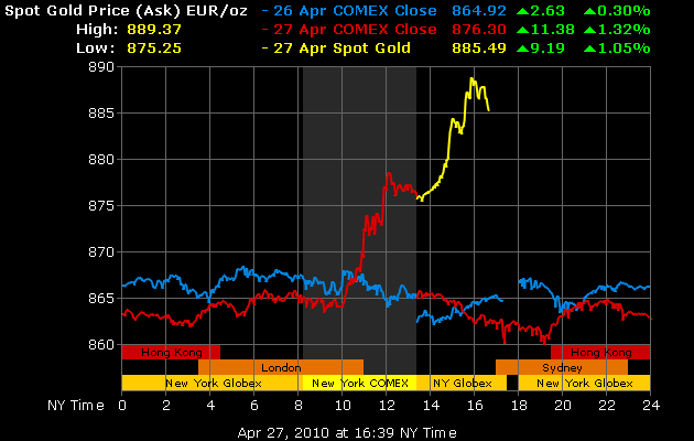 Gestern endlich mal wieder gesehen, das ein sinkender EUR/USD nicht automatisch sinkender Goldpreis bedeutet. Gold also sprunghaft gegen Euro UND USD gestiegen; das macht Hoffnung auf Gold als Krisenwährung auch bei professionellen Marktteilnehmern.