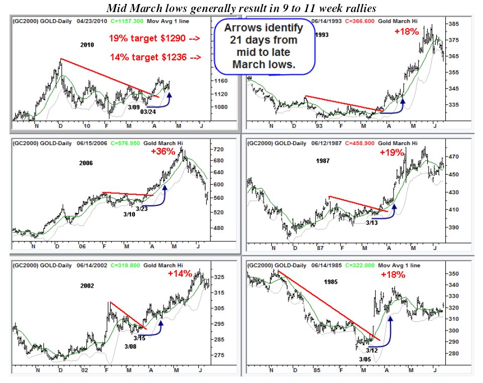 Ein sehr interessante charttechnische/ Vergleichs - Studie von Bob Hoye: Oftmals ist Gold in ähnlicher Konstellation im April nach oben abgehoben. Könnte demnach wieder so eintreten mit