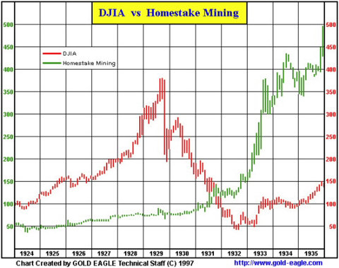 Goldaktien sind auch Aktien und werden sich zunächst wie diese verhalten, aber in einer späteren Goldhype ebenfalls stark ansteigen. Dies hat sich am Ende der großen Haussen so gezeigt, meine ich, wurde auch an einigen Beispielen hier gezeigt; In der Weltwirschaftskrise ab 1929 besonders ausgeprägtes Beispiel ist Homestake,sh. Anhang...Es ist schon richtig, daß Energie- und sonstige Kosten, für Umweltschutz zB, heutzutage weitaus größeren Einfluß auf die Gesamtproduktionskosten der Minen haben als früher.