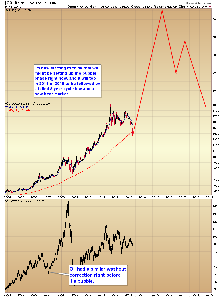 „..However with the panic sell off over the last two days and break of support at $1,523, I'm now starting to think what we are seeing is the washout prior to the bubble phase. The Nasdaq in `98, and oil in 2007 are perfect examples of the transition into the "bubble."...