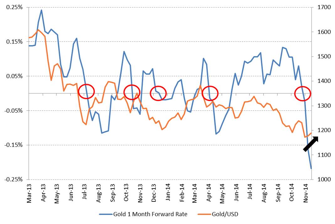 „..The sharp negative swing in gold forward rates is a positive development for gold investors as in recent history a negative forward rate has typically signaled demand to buy physical gold which has helped to support and at times move prices higher...."