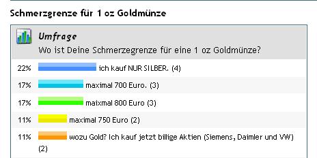ZWISCHENstand (nach einigen Stunden): Was mich überrascht hat ist, dass die aktuelle Mehrheit (22% also 4 Personen) "ich kaufe NUR SILBER" angegklickt hat...aus Spaß jetzt oder meint ihr das wirklich ernst? :hae: 8o