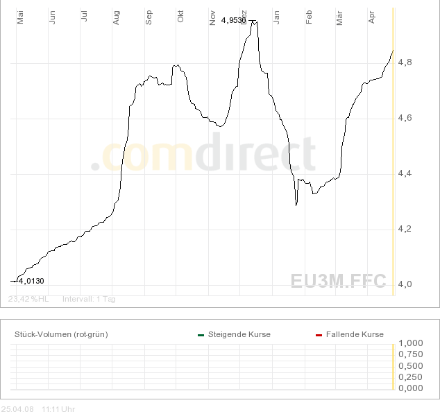 Der 3-Monats-Euribor steigt wieder stark an, wie zuletzt im August und November.