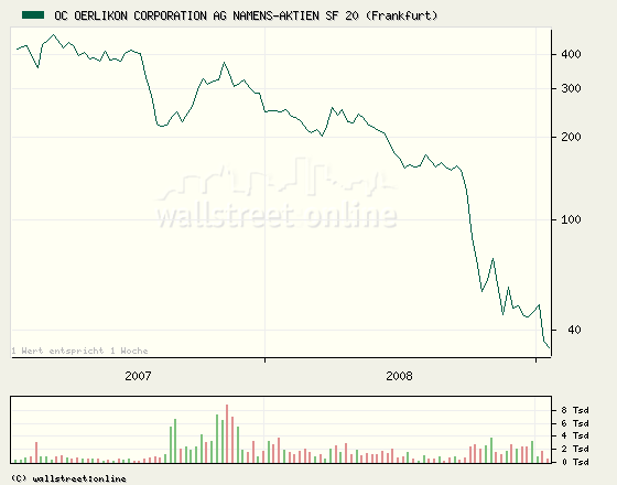 Hier mal ein Beispiel, wie eine Aktie verfallen kann. OC Oerlikon, ehemals ein Schweizer Bluechip. Wer da Anfang 2007 für rund 500 EUR das Stück eingestiegen ist, hat bis heute (29,11 EUR) rund 95% seines Einsatzes verloren. Ach ja, dies ist keine Anlageempfehlung. ![]()