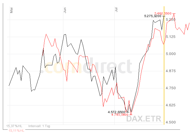 Dass die Aktienmärkte momentan also kaum auf derartige Nachrichten reagieren, ist ein Indiz dafür, dass die derzeitigen Verlierer auf der Bärenseite mental so stark gefesselt sind, dass sie sich nicht bewegen können. Denn deren Einstandspreise liegen im günstigsten Fall in der Nähe der 5.000er Marke, wo dann bei einem entsprechenden Rücksetzer für den DAX gute Nachfrage zu erwarten wäre. Das Überraschungsmoment bliebe jedoch wie gehabt an der Oberseite, wenn die Bären der vergangenen sechs Handelstage die Notbremse ziehen müssten und so für eine abermalige Squeeze sorgten.
