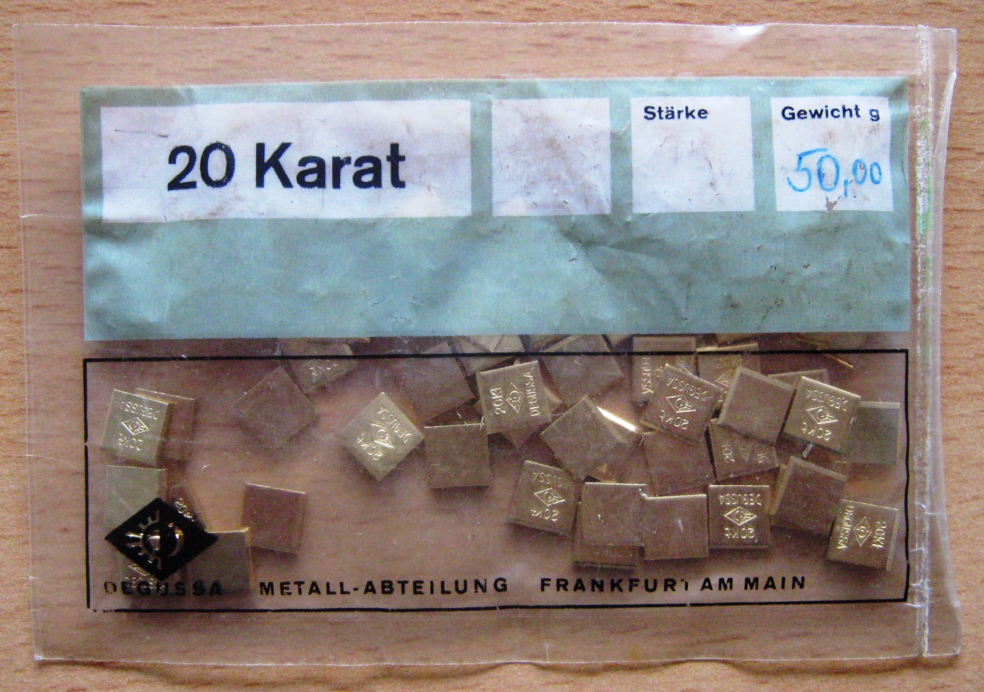 Habe, ebenfalls aus Familien-Nachlass, ganz ähnliche in einem 50erPack ... von Degussa. Jedes Plättchen besteht aus 20Karat Gold. Konnte man scheinbar in den 70er/80er Jahren von den entsprechenden Anbietern so erwerben.