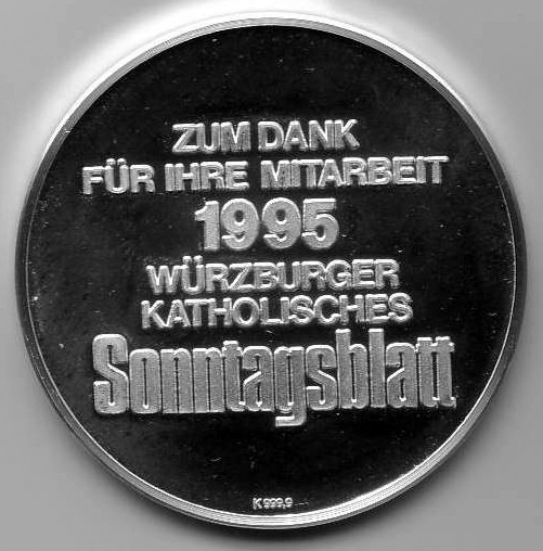 Motiv "Kloster Kreuzberg Rhön", in Auftrag gegeben 1995 vom Würzburger Sonntagsblatt bei der Tübinger Münze (Randstempel).