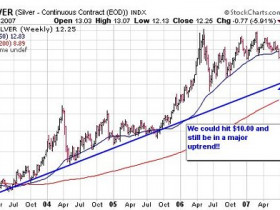 Study this chart carefully, notice when silver finally bottomed out in September 2003 right at the 200 day average it moved above $5.50 and very quickly shot up to the $8.40 level. Next silver kissed the major up trend in September 2005 near $7.00 and shot up to the $15 level by May 2006. Do you think silver could touch the $10 level, only to shoot up to $22 over eight months?
