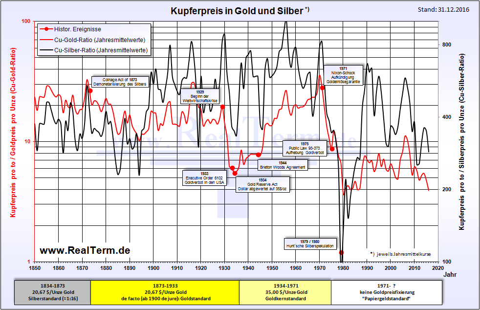 Tatsächlich kostete im Jahr 2016 im Mittel eine Unze Gold sage und schreibe 253kg Kupfer, mehr waren es zuletzt nur in 1980(!!!) mit 275kg Kupfer.