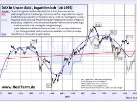 Vom Prinzip könnte der DAX seine 0,7 wieder erreichen, allerdings haben sich die Rahmenbedingungen (Goldmenge, Anteil Wirtschaftskraft DAX am Welt-BSP und vor allem der Dividendenanteil des DAX-Standes [DAX=Performance-Index!] geändert. Meine Abschätzung ergibt unter Berücksichtigung all dieser Faktoren, dass der DAX/Gold seinen alten Stand aus 1980 heute wieder erreicht hätte, wenn er unter 2 fallen würde. Allerdings ist diese Abschätzung wirklich nur eine Schätzung und letztlich ist es auch egal , ob "1" oder "2", das Prinzip und die Größenordnung sind wichtig.