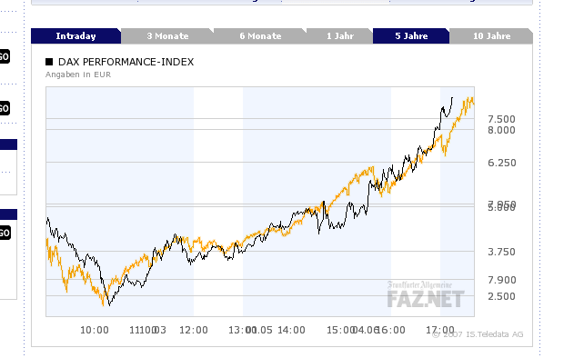 Übrigens: Man schaue sich das heutige Intraday an (schwarz) und vergleiche es mit dem 5-Jahres-Chart (orange).