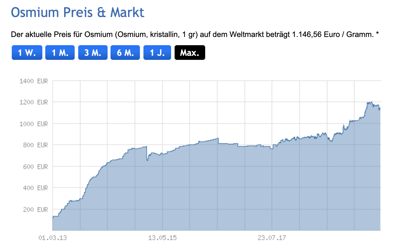 Osmium kennt die Welt damit schon seit über 200 Jahren (Roh-Osmium ist giftig da es Osmiumtetraoxid bildet), aber erst seit 5 Jahren wurde ein Prozess entwickelt um aus Roh-Osmium kristallines Osmium zu kristallisieren. (Mehrere Wochen im Hochofen, bei speziellem Druck, Temperatur und einem speziellem Gasgemisch wird aus Roh-Osmium kristallines Osmium) Durch den Kristallisations-Prozess ist damit Osmium jetzt auch für die Investorenwelt und die Schmuckindustrie extrem interessant geworden,...