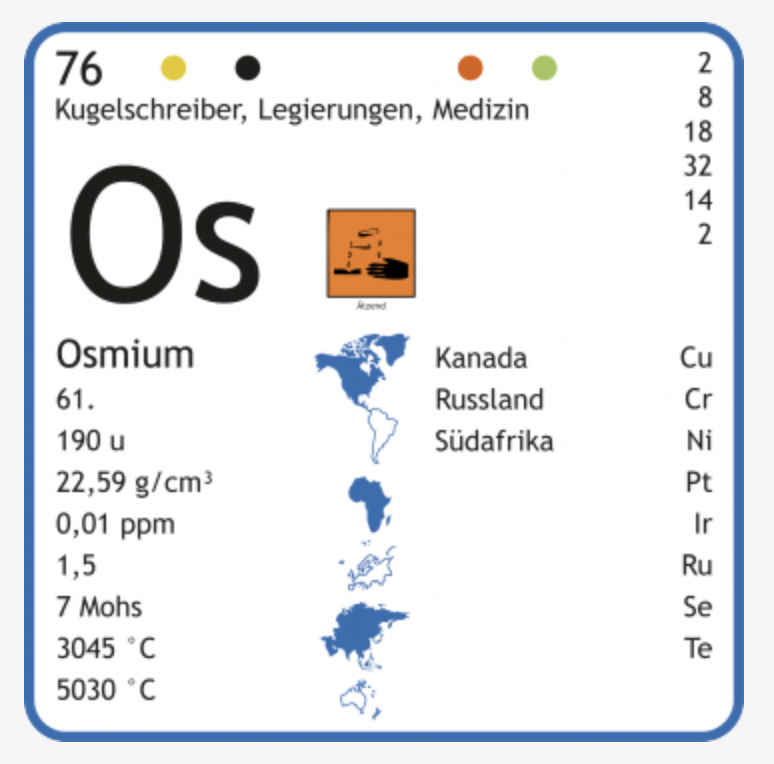 Osmium ist ein Übergangsmetall und gehört zu den Elementen der Gruppe 8 (Eisen, Ruthenium, Osmium, Hassium) des Periodensystems. Das Symbol für Osmium ist Os und seine Ordnungszahl ist 76. Osmium ist ein primordiales chemisches Element, d.h. es existierte in seiner heutigen Form bereits vor der Entstehung der Erde - anders als z.B. Hassium, das erst 1984 synthetisiert wurde.