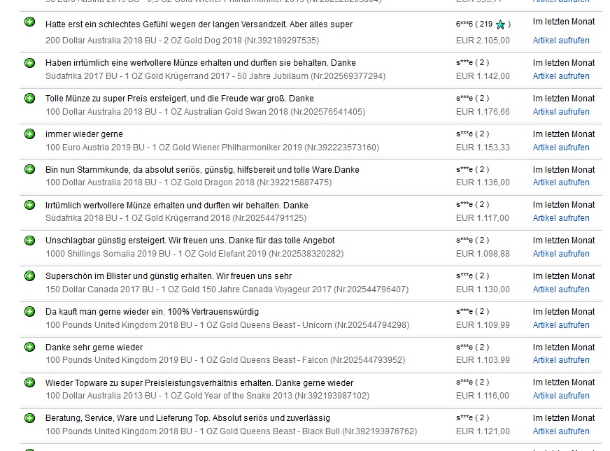 In den letzten 15 Bewertungen sind etliche Goldmünzen aus dem Zeitraum 22.12. - 28.12.2018