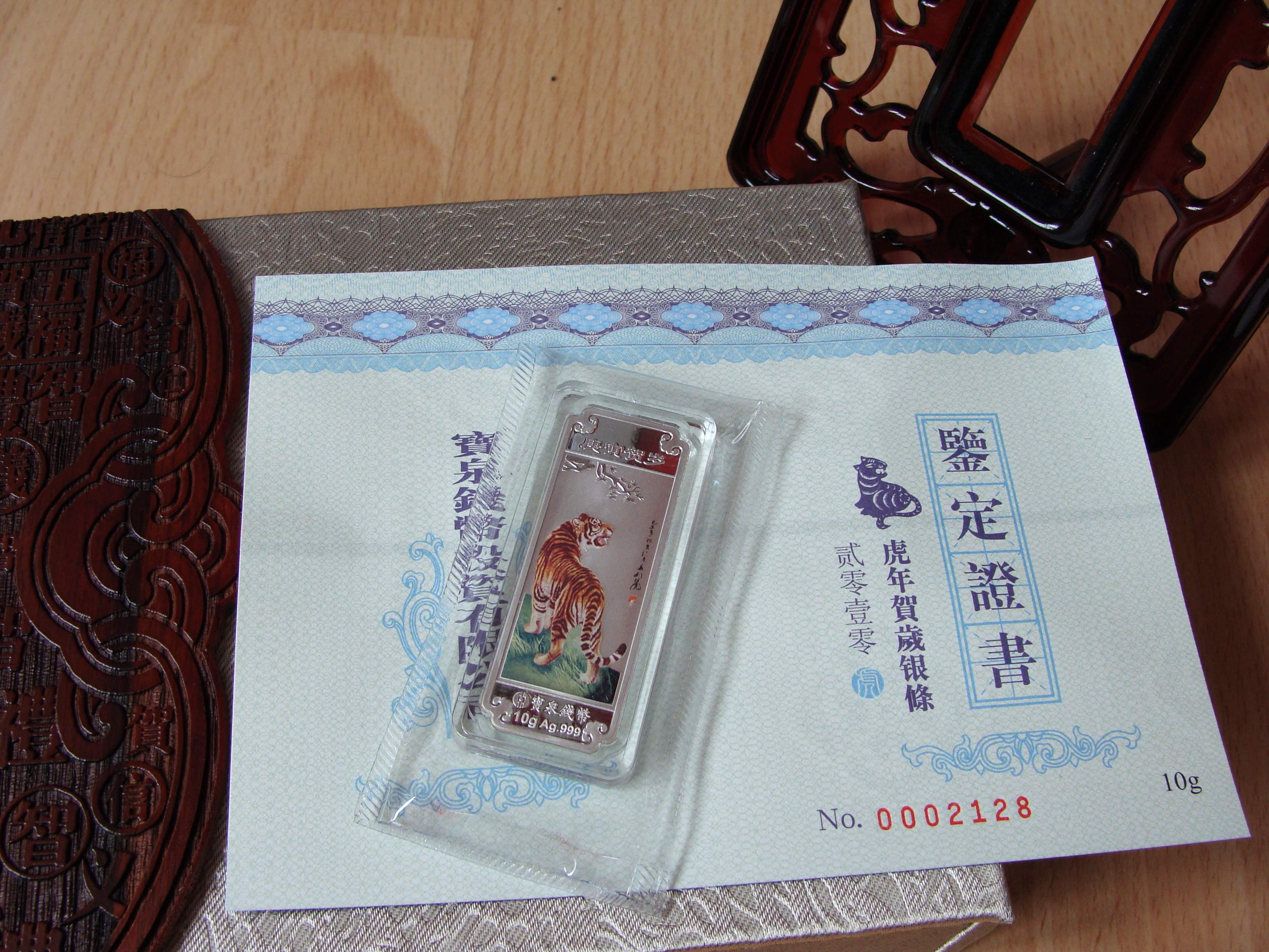 Bin gestern aus meinem Urlaub in Hong Kong zurück gekommen und wollte mal noch meine zwei kleinen Mitbringsel zeigen. Der schon bekannte 100g AG Collar Barren und dann noch ein 10g AG Tiger farbig Barren.Entweder hab ich ihn hier bisher noch nicht gesehen oder nur übersehen!? Auch wenn es nur 10g sind hat er eine ordentliche Schachtel, Zertifikat etc... Zu kaufen gab es auch 10g Gold Barren usw...