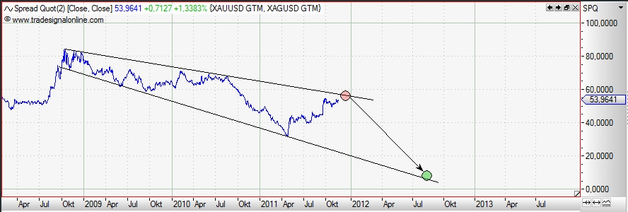 charttechnik auf das gs ratio angewendet. sieht bullish für silber aus. gs ratio von 1:10 bis 1:15 schon im nächsten jahr?