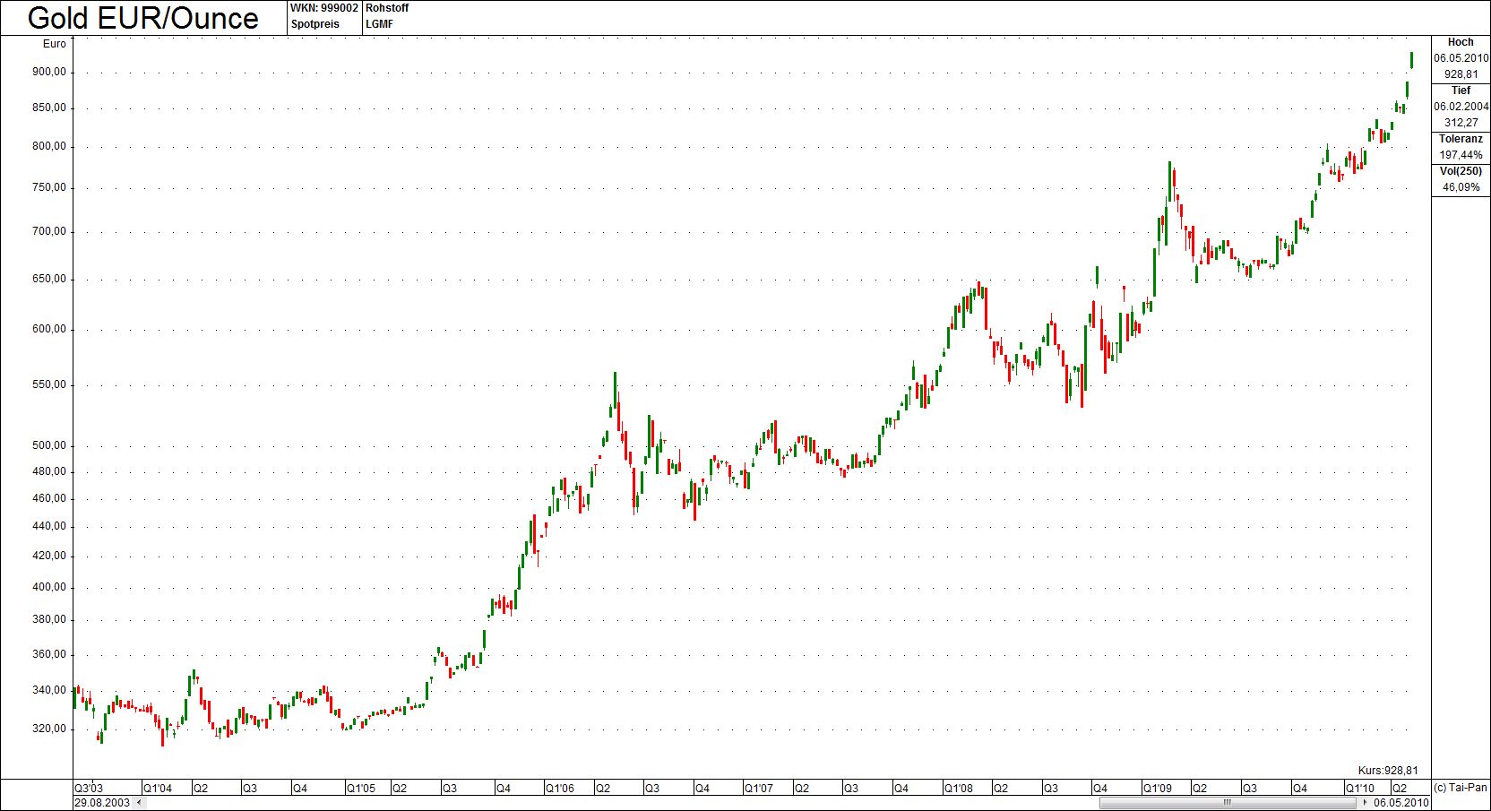einen Chart vom Goldpreis in Euro ab Januar 2005 bis heute, wöchentliche candlesticks, logarithmische Skalierung, einstellen?